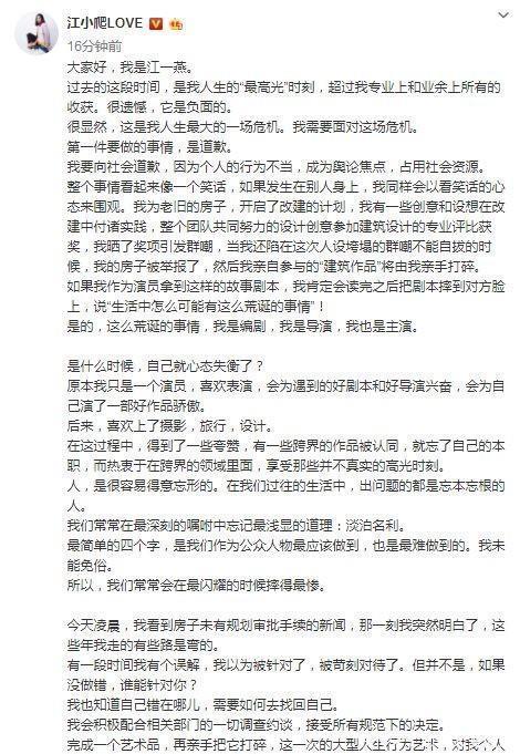 江一燕随后发文致歉,称自己会积极配合相关部门的一切调查约谈,接受所有规范下的决定。