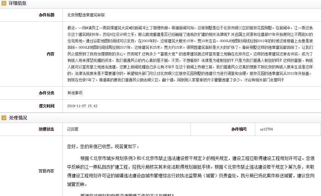 据北京日报2019年11月报道,“演员江一燕获得建筑大奖”的新闻冲上了微博热搜。有“眼尖”的网友认出,这栋别墅位于北京市顺义区的丽京花园,通过网络地图发现,该别墅存在就地重建的行为,怀疑其属于违章建筑,并向相关部门发起举报。